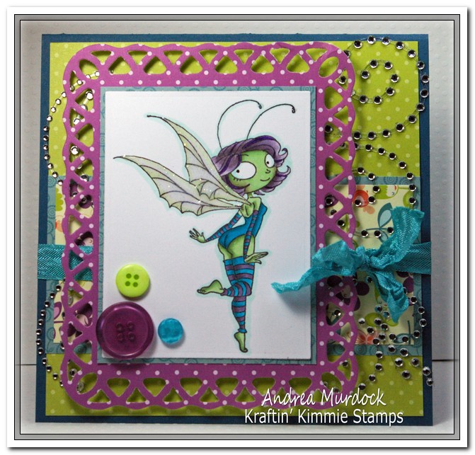 Also on my card is Annie`s newest line for KKS...her mini fairies. I am in love. Yes I realize I fall in love with crafty items fast and easily but these girls...they own my heart. I am such a fairy girl as shared in my first sneak peek this week. Didya like how I slipped in that forshadowing hee hee. I am feeling a wee bit tricky myself this week. This adorable cheeky fairy is Clarabelle and I cannot get over her cayuoote butt! I went a bit different and gave her green skin so hubby calls her my alien fairy. I used the following copics if you are interested in using this look-